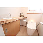 将来を見据えアームレスト付のトイレに 無垢カウンターがお部屋のアクセントに