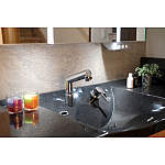ウォールナットのハイドアとタイル仕上げの壁に堂々と佇むラシス 空間に合わせて壁から壁までぴったり