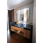 サイドにブラック壁を立ち上げゲートをイメージした上質な洗面空間は「大人スタイル」に変身