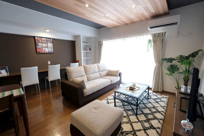 ブラックと木目をほどこした天井がインパクトを与えるリビング