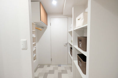 ウォークインクローゼットの隣にはパントリー ここからキッチンのほうへ抜けれます回遊できるプラン