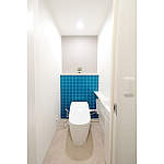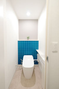 トイレはクロスを貼り分けて遊び心のある、オシャレな空間に。カウンターを設けることで使い勝手も良くなりました。