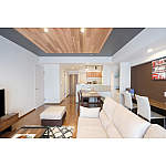 ブラックと木目をほどこした天井がインパクトを与えるリビング