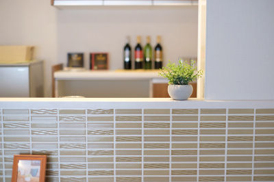 キッチン裏の壁にアクセントとして モザイクタイルを貼りました。ミックスに貼りかわいらしく仕上げました