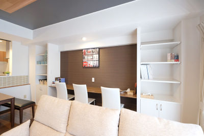 リビングの一角を書斎として使えるスペースに。家族と同じ空間にいながらご主人がPCを使ったりと便利に使えます。