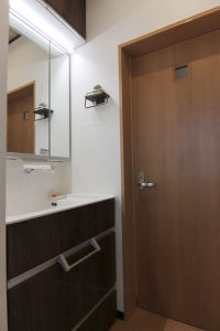 吊戸棚の収納を活かせるよう、新しくステップ付きの洗面化粧台に。