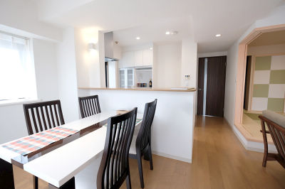 4LDKを3LDKの間取りに変更 リビングは無垢材を貼り和室にはクロスで部屋をアクセントにしました 設備を入れ替えマンションが蘇りました