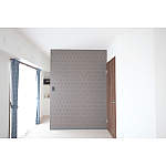 暗くなりがちなシューズクローク内はオシャレなアクセントクロスで元気カラーに!