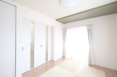 リビングとつながる和室 天井にグリーンの色がはいることにより落ち着きのある空間に