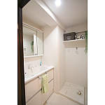 洗面台と洗濯機の位置を変更してバススペースを広くしました 三面鏡の裏に収納でき、また洗濯機上にも棚をつけ物が置けるようになりました