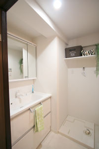 洗面台と洗濯機の位置を変更してバススペースを広くしました 三面鏡の裏に収納でき、また洗濯機上にも棚をつけ物が置けるようになりました