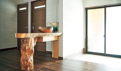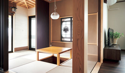 玄関を入るとすぐに和室の小上がりへ、その先はLDKへと続きます。和のテイストを現代風に取り入れて、洗練された中にも心和む空間に仕上がりました。