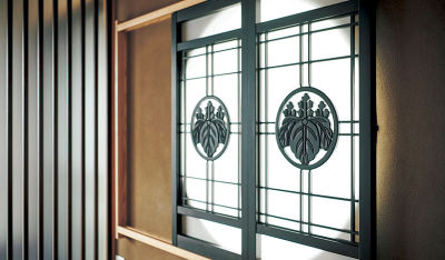 旧家の玄関脇を飾っていた家紋入りの建具は、和室の障子に。円窓からの採光で印象的に浮かび上がります。