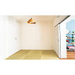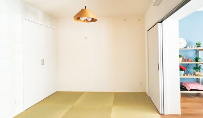 市松模様の半畳の畳がお洒落な和室。引き戸を開ければLDKと一体化。