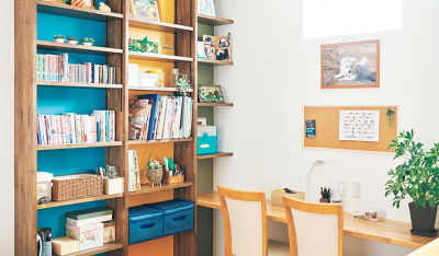書斎コーナーは趣味のアクセサリーづくりなどに活用。本棚背面の青と黄の壁紙がお部屋のアクセントに。
