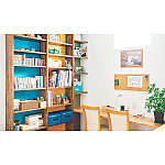 書斎コーナーは趣味のアクセサリーづくりなどに活用。本棚背面の青と黄の壁紙がお部屋のアクセントに。