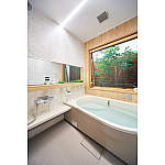 緑の木々を眺めながらゆったりお風呂に入りたいというご主人の希望をかなえたN様邸。外構と浴室をあわせてプランニングし、坪庭の見えるお風呂が完成。浴室から続く洗面脱衣室を裏の押し入れ側に広げ、明るく開放的な水廻り空間が生まれました。
