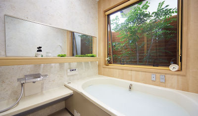 外構と浴室をあわせてプランニングし、坪庭の見えるお風呂が完成。