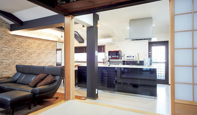 LDKと和室を見渡せるオープンタイプのキッチン。梁とあわせてブラックで統一。