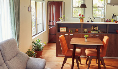 子どもたちが巣立ち、夫婦ふたりでゆったり暮らせる間取りにしたいと思いました。キッチンスペースの移動は、思いもよらない発想でしたが、おかげで明るく風通しの良いLDKになりました。季節で移り行く景色が、リビング、キッチン両方から眺められるのが、この上ない贅沢ですね。