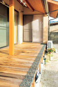 奥行きのある半屋外空間のウッドデッキ。庭では家庭菜園も始める予定だとか。