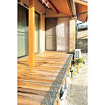 奥行きのある半屋外空間のウッドデッキ。庭では家庭菜園も始める予定だとか。