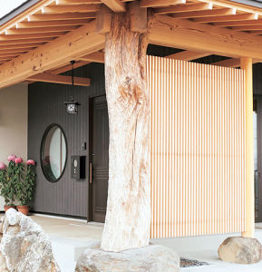大広間にあった立派な床柱は、表玄関の象徴に。柱を支えている束石は、旧家で庭石として置かれていたもの。