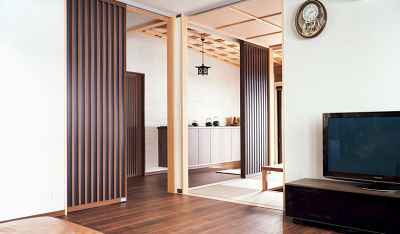 3枚引き戸を開け放てば、玄関からの陽射しがリビングまで行き渡ります。