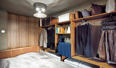 寝室の壁一面に設けたオープンクローゼットで衣類の収納は万全。
