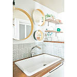 ヴィンテージ空間をつくり上げるため、担当者といっしょに建具・建材ショップを回り、壁紙やタイルなど細部に至るまで選び抜きました。S様がもうひとつこだわったのは、メンテナンスのしやすさ。洗面所のシンクは水が飛び散りづらいよう、大きいものを探しました。