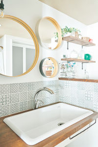 洗面所には貼りたいタイルの高さに合わせて水栓を採用。