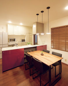 オープンキッチンとダイニングも落ち着いた色合いに。ペンダントライトは奥様のお気に入り。