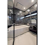 ガラスの扉とシックな色合いのモダンな浴室はご主人のお気に入り。