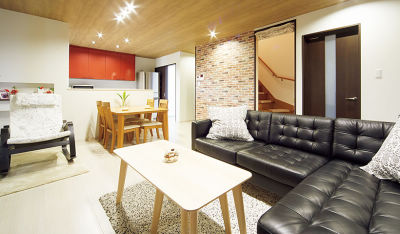 LDKは木目の天井やレンガの壁紙でスタイリッシュな空間に。