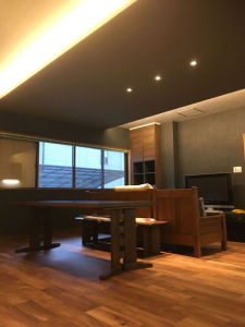 自営業のため自宅の一室に事務所スペースがあるが、いかにも事務所という作りのため使いやすく、家族も利用できるおしゃれな空間にリフォームしたいとのご要望。必要なPCスペースを確保しつつ、リビングのように寛げるソファースペースや家族が団らんできるダイニングスペースをシステム収納などを使いエリア分け。ソファを置く場所は天井を一部下げ、座った時にリラックスできる演出をしました。建築家照明をふんだんに使いホテルライクな空間に。