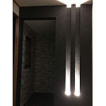 エントランスには壁にナロービームライトを設置。黒い壁紙にしたことでより一層映える空間になった。