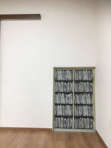 作り付け収納は遊び心のある壁紙を扉に使用した。