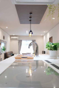 ご主人様の要望でホワイトカラーでまとめたコーディネート アクセントで天井の一部を下げ、色を入れポイントにしました キッチンはアイランドタイプ また大容量のカップボード収納にこだわりました