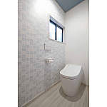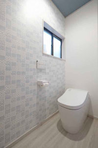 ブルーのタイル調の壁紙で清潔感あるトイレに