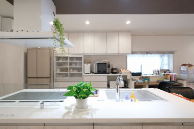 動線が短くなり非常に楽になった。お客様は玄関から家族は裏玄関からと分れたことでお客様を迎えやすくなった。それに増して何より収納が増えたことが大きい。LDKはご友人が来られた時にモデルルーム見たいと言っていただけるほどで大変気に入っている。キッチンを囲んでの会話は今まで以上に楽しい時間となりLDKのどこにいても顔が見え会話が聞こえることが幸せです。家族もこだわった洗面はいつでも気持ちよく使えるので喜んでいます。ほんとに満足しています。