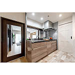 キッチンとダイニングの壁をとり、向きを変えて対面式にしました。リビングダイニングが見渡せてるので、家族との会話も弾みます。キッチンから洗面室へ通り抜けられるように引戸を設置しました。お料理をしながら洗濯がし易いよう家事動線を見直したことで、効率が良くなりました。