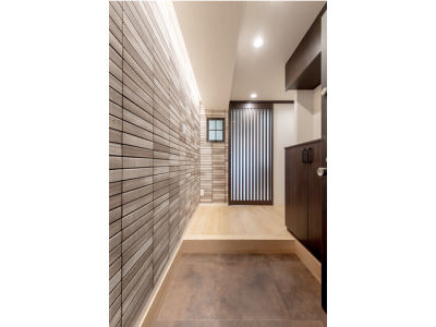 玄関には優雅な趣のあるデザイン壁、ダウンライトと建築化照明を取り入れ、柔らかな陰影で高級感をだしました。