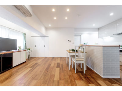 間仕切り壁をとり、光がたっぷり降り注ぐ広くて明るいLDKになるよう間取り変更をご提案しました。扉を開ければ2方向から光が入るので、とても明るいお部屋です。キッチンは調理しやすいようにガスコンロの配置を変えて、家事動線を考慮した家電収納と食器棚を設けました。機能的な収納スペースと居心地のよいLDKでお客様のご要望に応えることができ本当に嬉しく思っています。