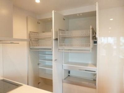 カップボードのソフトダウンウォールユニットは奥様に嬉しい楽々収納です。