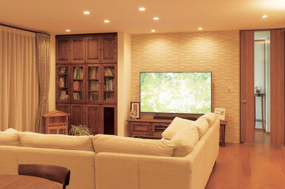 ご主人の夢だったリビングシアター。迫力の映像に音響、照明もコントロールできて雰囲気アップ。