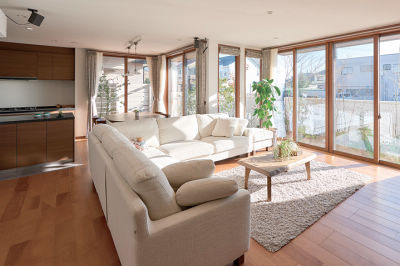 一番思い入れが強かったのは「緑が見える暮らし」。その想いを実現すべく、庭に面した南東側を天井いっぱいの全面窓にする、思い切ったプランをご提案。長期優良住宅耐震等級3を取得して耐震性能を確保し、全面窓と26帖の開放的なLDKの両方を実現しました。