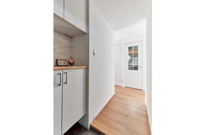 玄関収納の天板は無垢板。正面の納戸の扉は、採光窓のある白にし、明るい印象に。