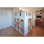 収納スペースの確保のためにご主人が考えられたのは、ロフトベッドでした。そこで、子供部屋と書斎をひとつにし、ご夫婦の寝室にもなる大きなロフトベッドをつくり上げました。たっぷりの収納スペースを確保しただけでなく、「床で寝るよりもあたたかく、視線も高くなって今まで見ていた窓の景色も変わり、新鮮な気分です」と奥様も快適性に満足されています。