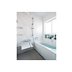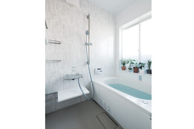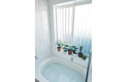 窓を1面に減らしても朝日が差し込む、明るい浴室。窓辺にはグリーンも。