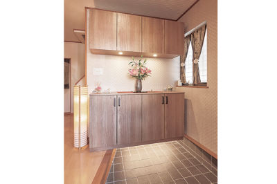 「家具のようなインテリア性の高いキッチン」をというのが奥様からのご要望でした。インテリアや小物、雑貨集めがお好きな奥様のリクエストでカップボードはセパレート型にし、その間に間接照明を埋め込んだ飾り棚を設けました。お気に入りの小物たちが美しく照らされ、キッチンの雰囲気を高めます。扉柄や壁紙などは、ダイニングのインテリアに合わせてセレクトしたことで、まるでダイニングキッチンをまとめてリフォームしたような一体感が生まれました。